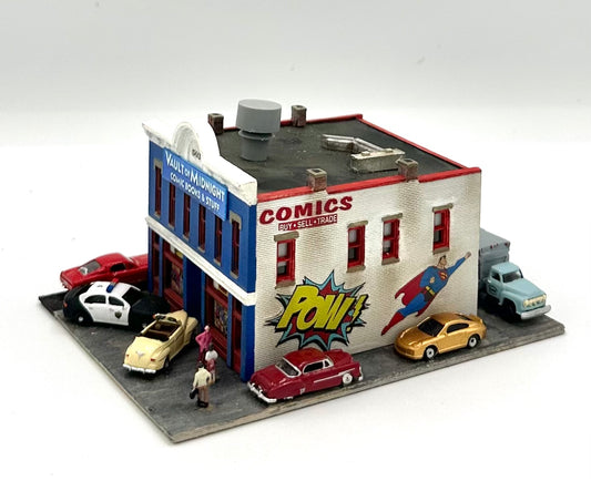 Woodland Scenics DPM, N Scale Custom Weathered 2 Story "Vault of Midnight " Comic Store Diorama.