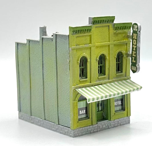 N Scale 2-Story Bar/Hotel Custom Weathered Paint , Awning , Roof garden.